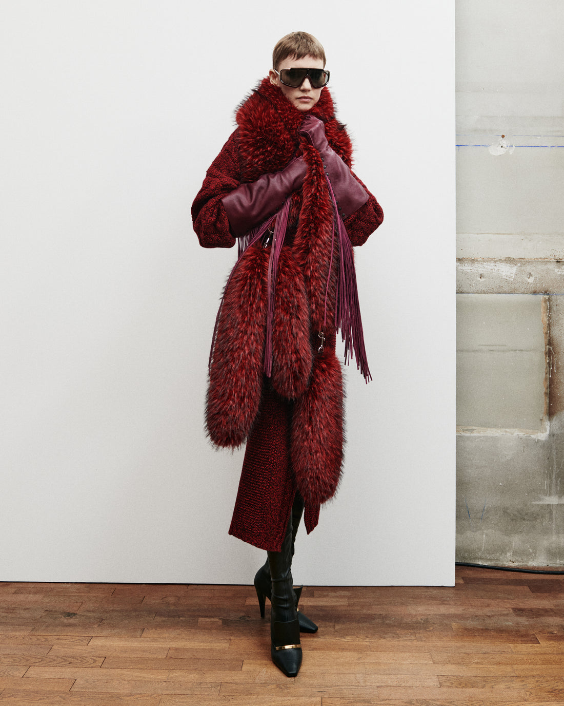 Accessories punctuate the silhouettes with bold details. Voluminous hats and cuissarde boots with exaggerated tongues and buckled leather variations accompany opera-length gloves, while the Compagnon and new Venus bags become canvases for Art Deco–inspired leather inlays.